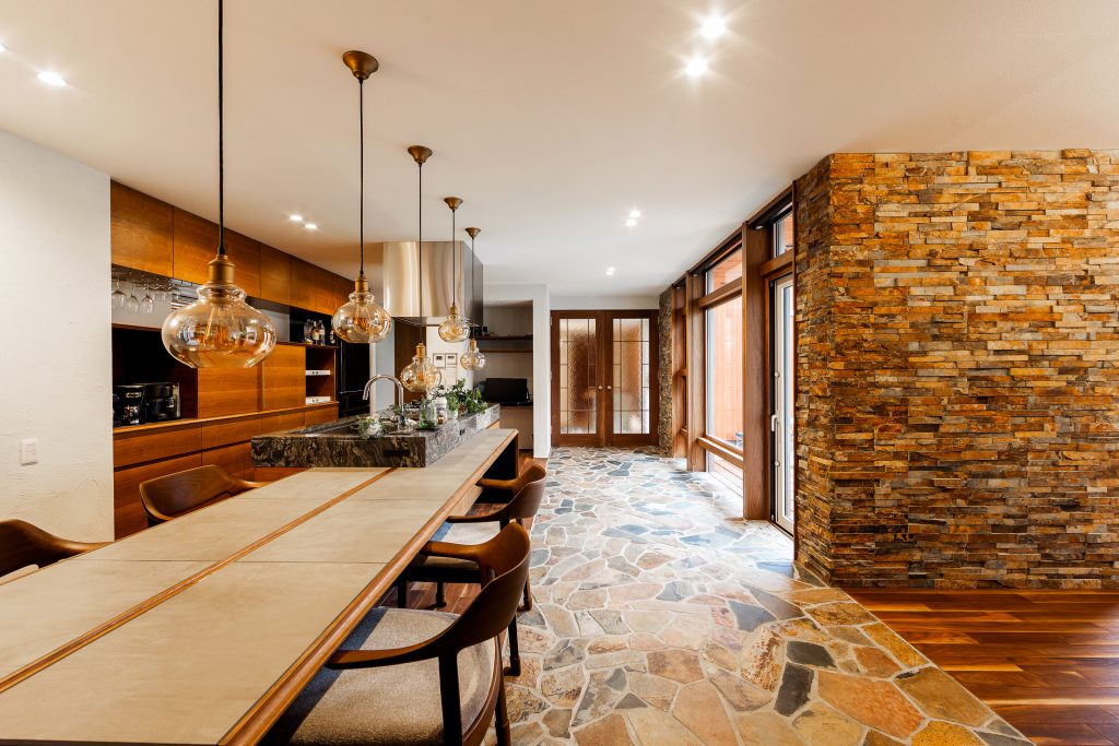 小端積み石の壁と石畳の床に造作ドアが際立つラグジュアリーなDK