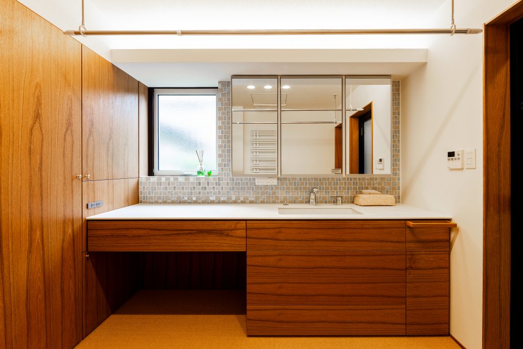 人工大理石の天板にチークの扉を使った造作洗面台。白いガラスタイルが美しい。