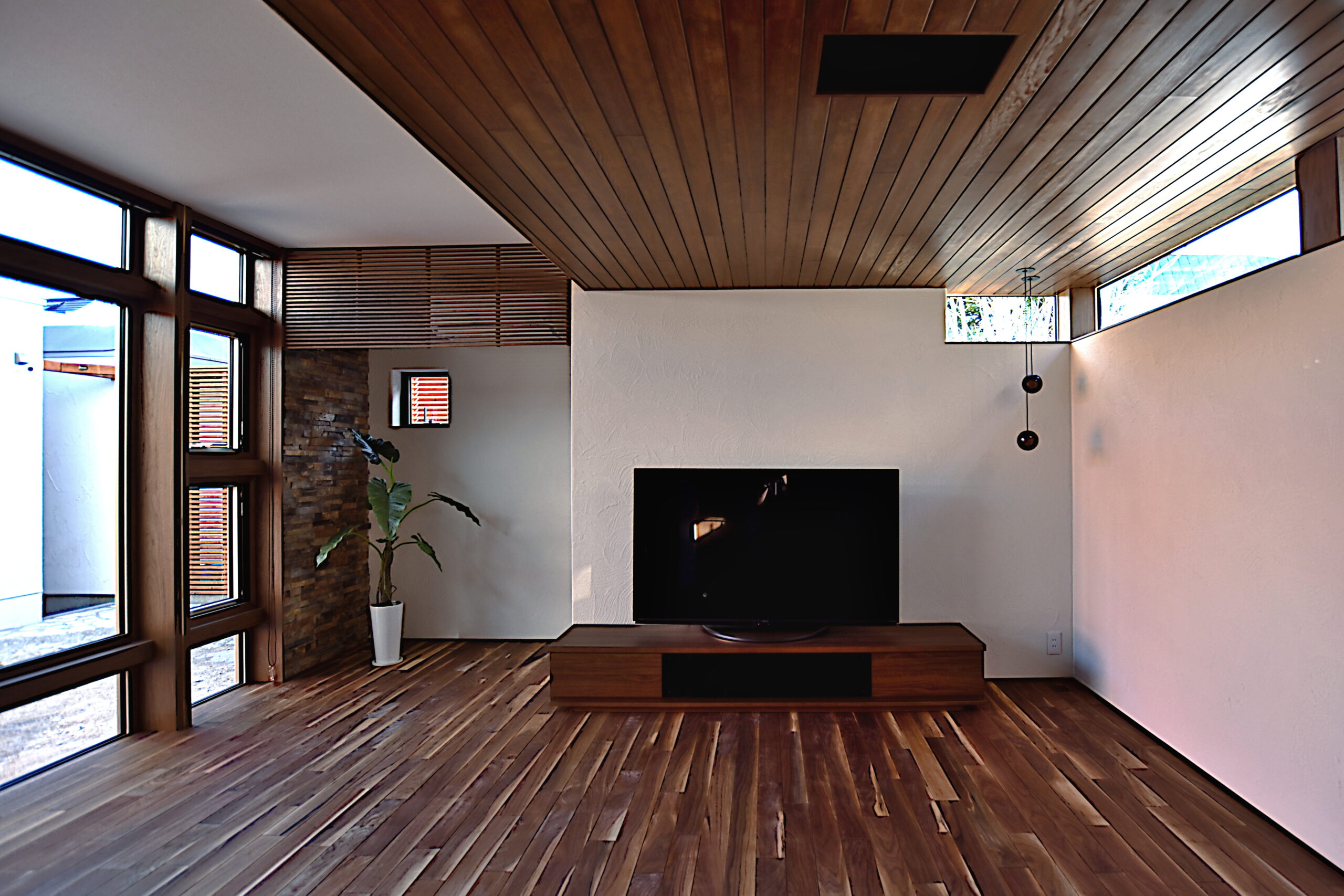 白の塗り壁と石を基調にレッドウッドのルーバーで水平ラインを強調した外観